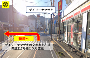 ②デイリーヤマザキの交差点を左折し、県道217号線に入り直進。