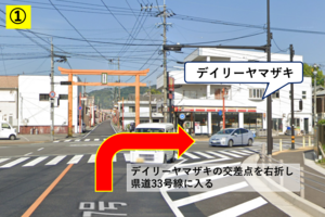 ①デイリーヤマザキの交差点を右折し県道33号線に入る。