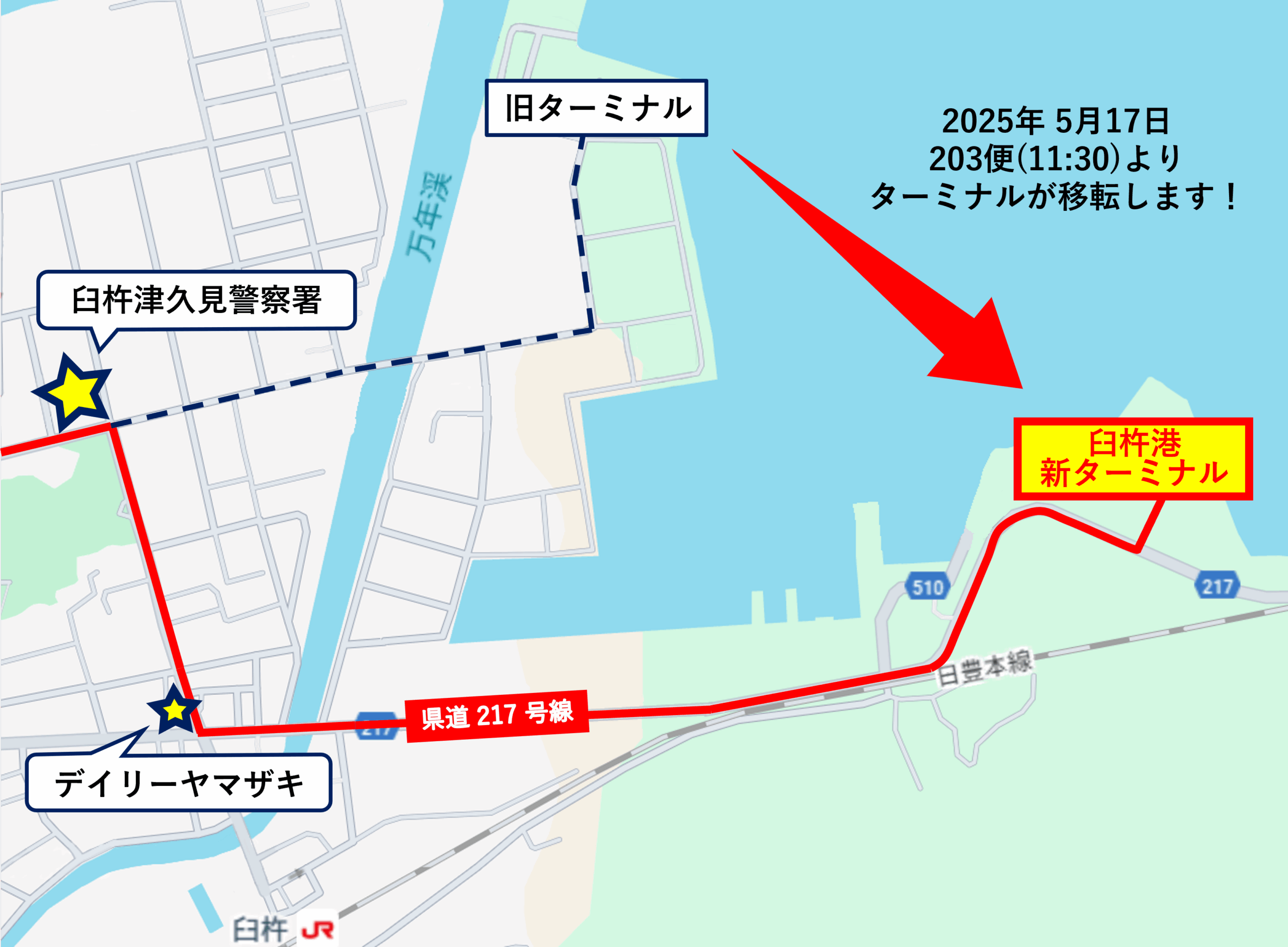 2025年5月17日(土)203便(11:30)より、臼杵フェリーターミナルが移転いたします。