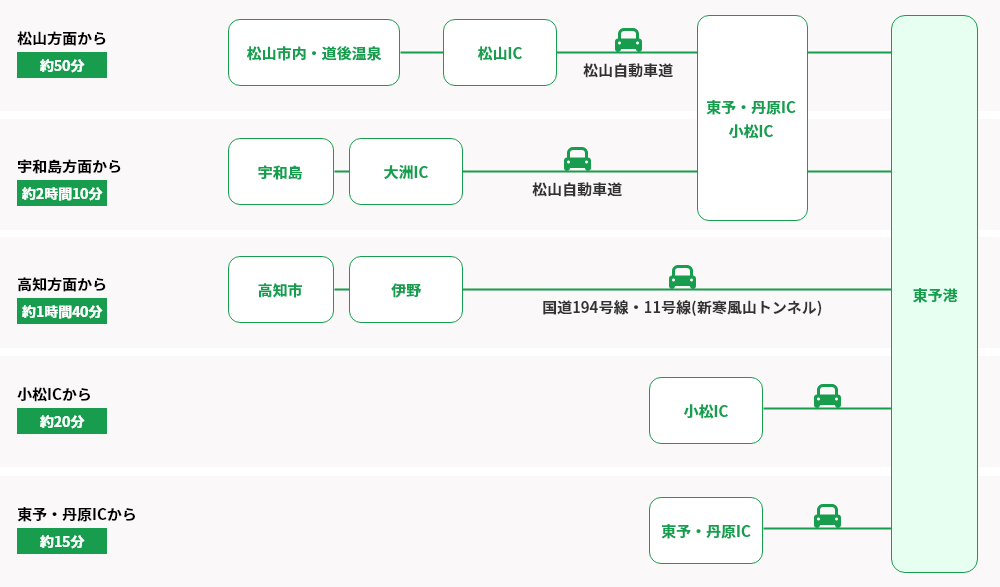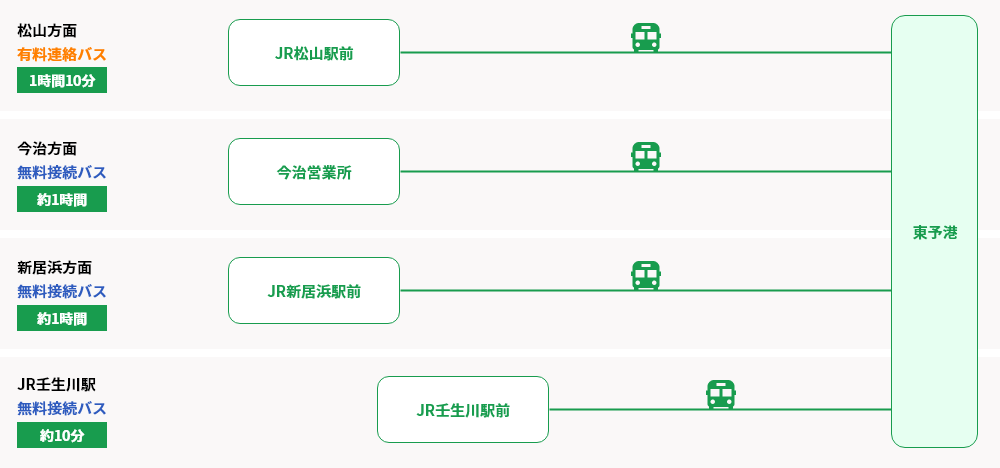 ※JR壬生川駅から東予港まではタクシー利用にて約10分となります。